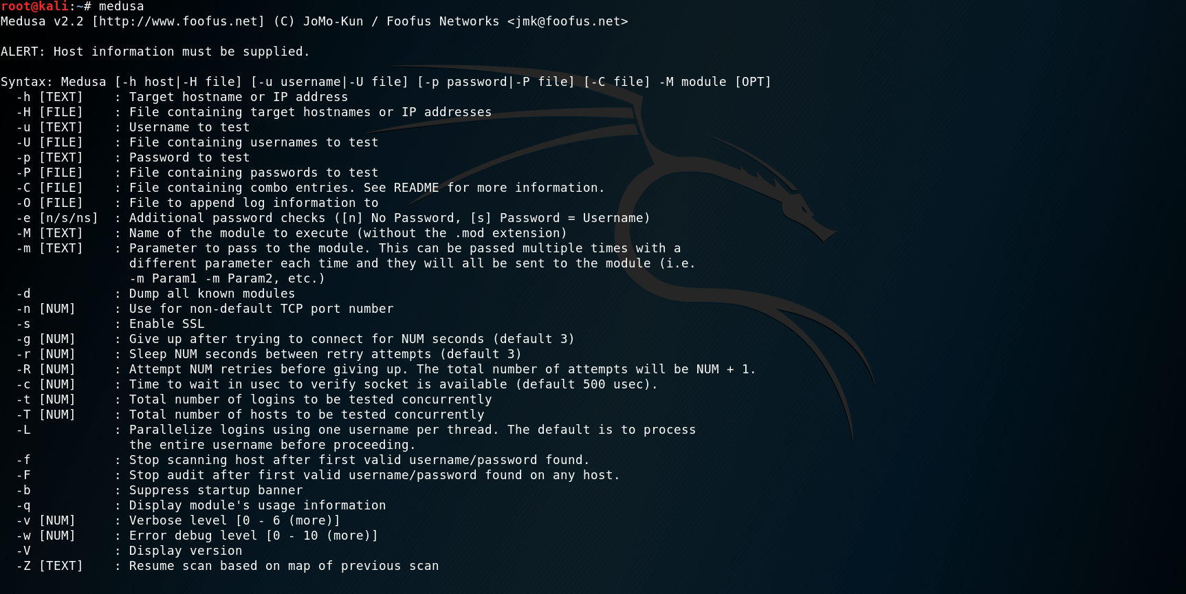 medusa -h 目标IP地址 -u 用户名 -P 字典文件 -M 协议模块