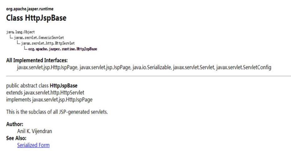 Tomcat将JSP文件编辑后生成的Java文件,继承与HttpJspBase。通过Apache官方文档查看