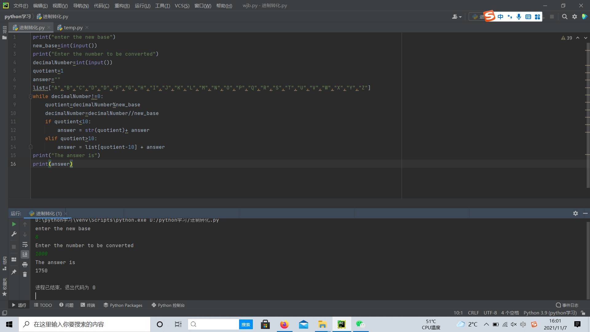 1 print("enter the new base") 2 new_base=int(input()) 3 print("Enter the number to be converted") 4 decimalNumber=int(input()) 5 quotient=1 6 answer="" 7 list=["A","B","C","D","D","F","G","H","I","J","K","L","M","N","O","P","Q","R","S","T","U","V","W","X","Y","Z"] 8 while decimalNumber!=0: 9 quotient=decimalNumber%new_base 10 decimalNumber=decimalNumber//new_base 11 if quotient<10: 12 answer = str(quotient)+ answer 13 elif quotient>10: 14 answer = list[quotient-10] + answer 15 print("The answer is") 16 print(answer)