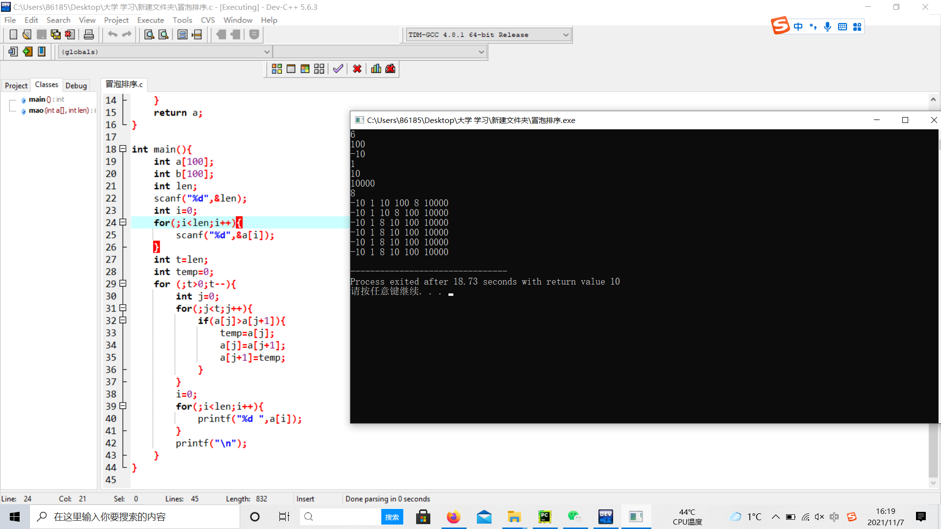 1 #include <stdio.h> 2 int mao(int a[],int len){ 3 int i=len; 4 int temp=0; 5 for (;i<len;i--){ 6 int j=0; 7 for(;j<len;j++){ 8 if(a[j]>a[j+1]){ 9 temp=a[j]; 10 a[j]=a[j+1]; 11 a[j+1]=temp; 12 } 13 } 14 } 15 return a; 16 }