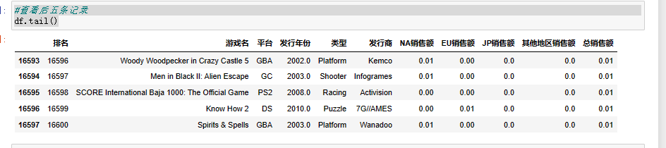 1 #查看后五条记录 2 df.tail()