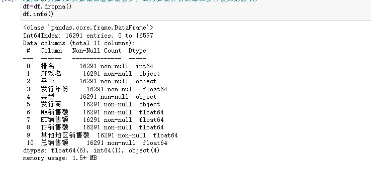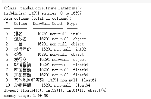 2 df.columns=['排名','游戏名','平台','发行年份','类型','发行商','NA销售额','EU销售额','JP销售额','其他地区销售额','总销售额']