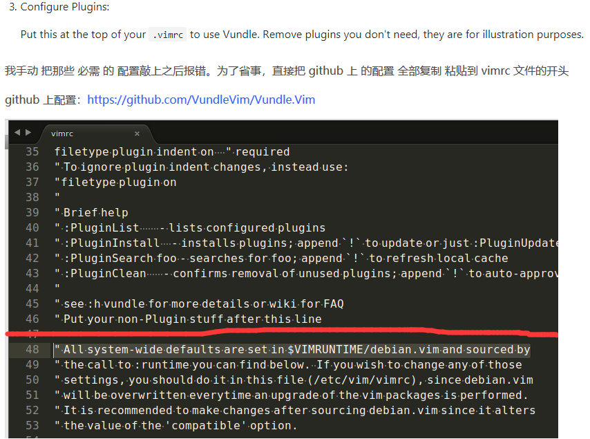 上半部分 是 添加 的 vundle 的配置部分。下半部分是 vimrc 原始 内容。