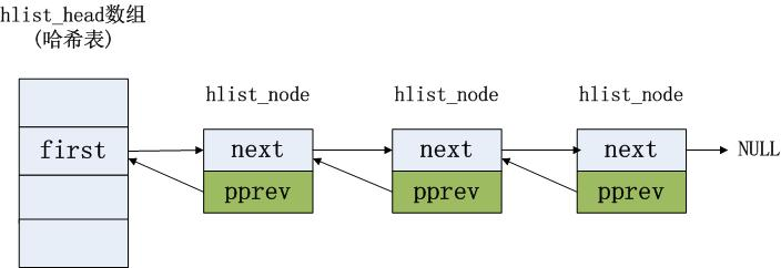 struct hlist_node **pprev; //指向上一个结点的next指针的指针