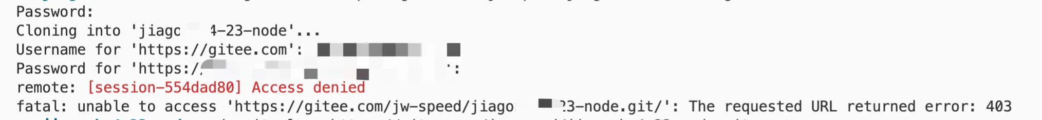 突然想到我在gitee.com上面有2个账号,一看报错的前面是必须要我填写用户名和密码的。我习惯性填写了常用的那个账号的信息,但是本次的代码是在另外一个账号上面的就换账号信息,铛铛~clone成功啦!