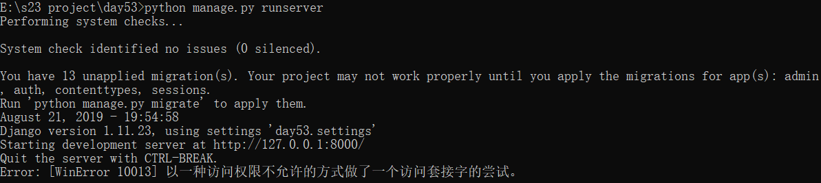启动django应用报错 “Error: [WinError 10013] 以一种访问权限不允许的方式做了一个访问套接字的尝试。”