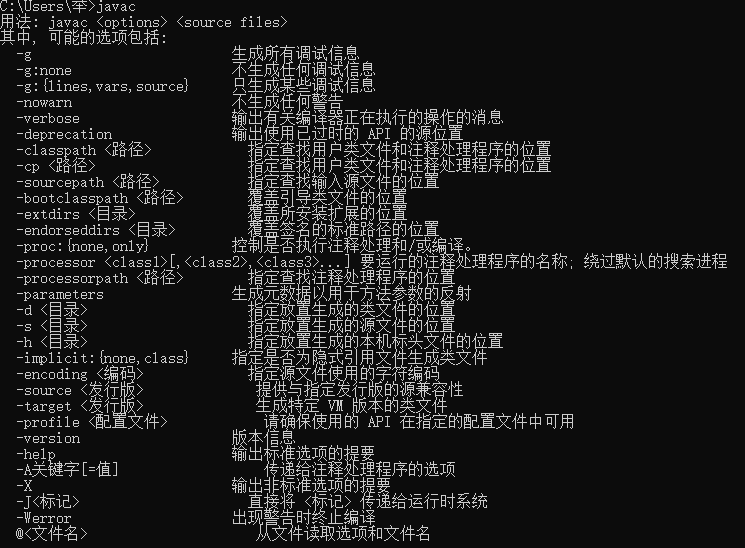 - 配置完这三点在指令界面输入javac,java-version,如果出现以下内容即为安装成功。