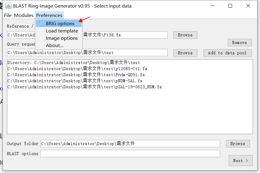 2.2.1解压BRIG-x.xx-dist.zip,双击BRIG.jar,运行BRIG。通过Preferences>BRIG options,设置blast+软件路径