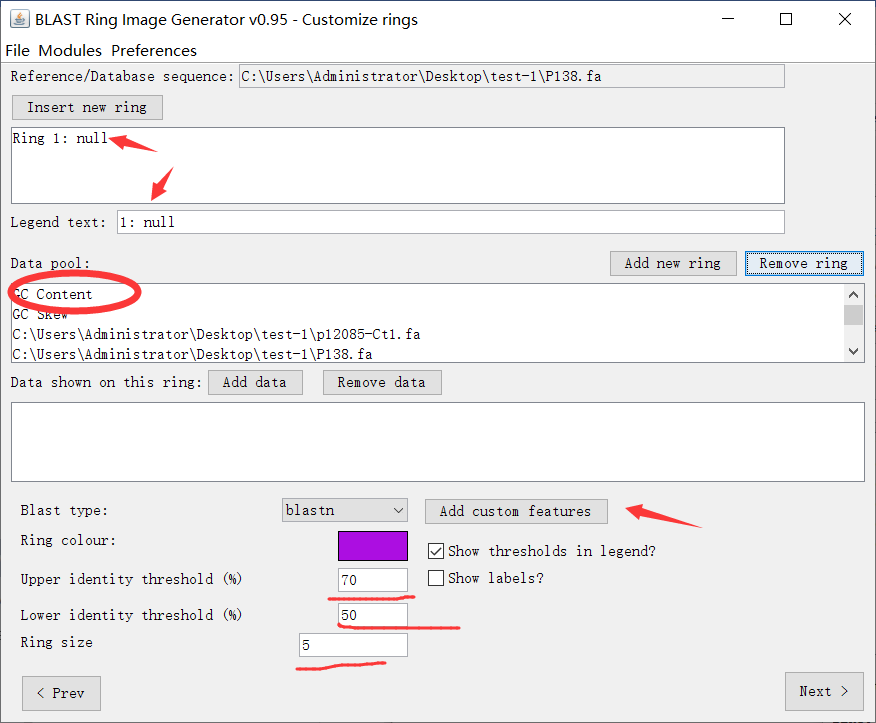 接下来是设置圈的信息,ring1就是第一圈,一般ring 1和ring2直接设置gc content和gc skew,就是下面的两个,选择一个圈,点击add data添加圈的信息,在legend text里面命名圈的名字