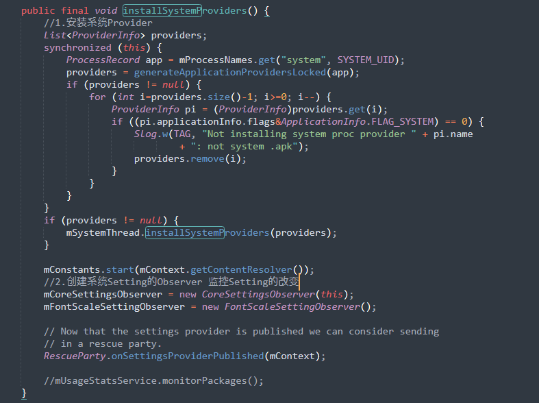 1>.mActivityManagerService.installSystemProviders(); 安装系统的Providers,并创建系统核心Setting Observer 用于监控系统Setting的改变