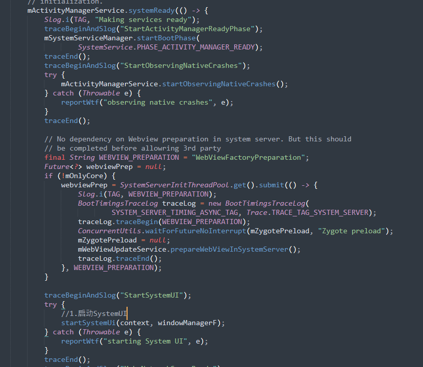 由上面的两段代码分析AMS的启动流程主要做了那些事情可知:
