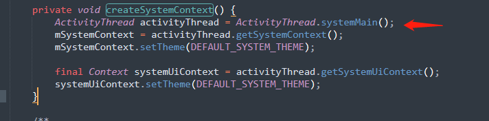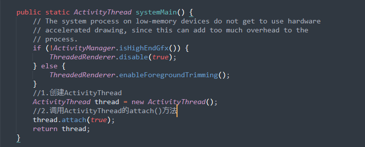 通过调用systemMain()会创建一个ActivityThread.这个ActivityThread是给systemServer进程使用的。代码如下: