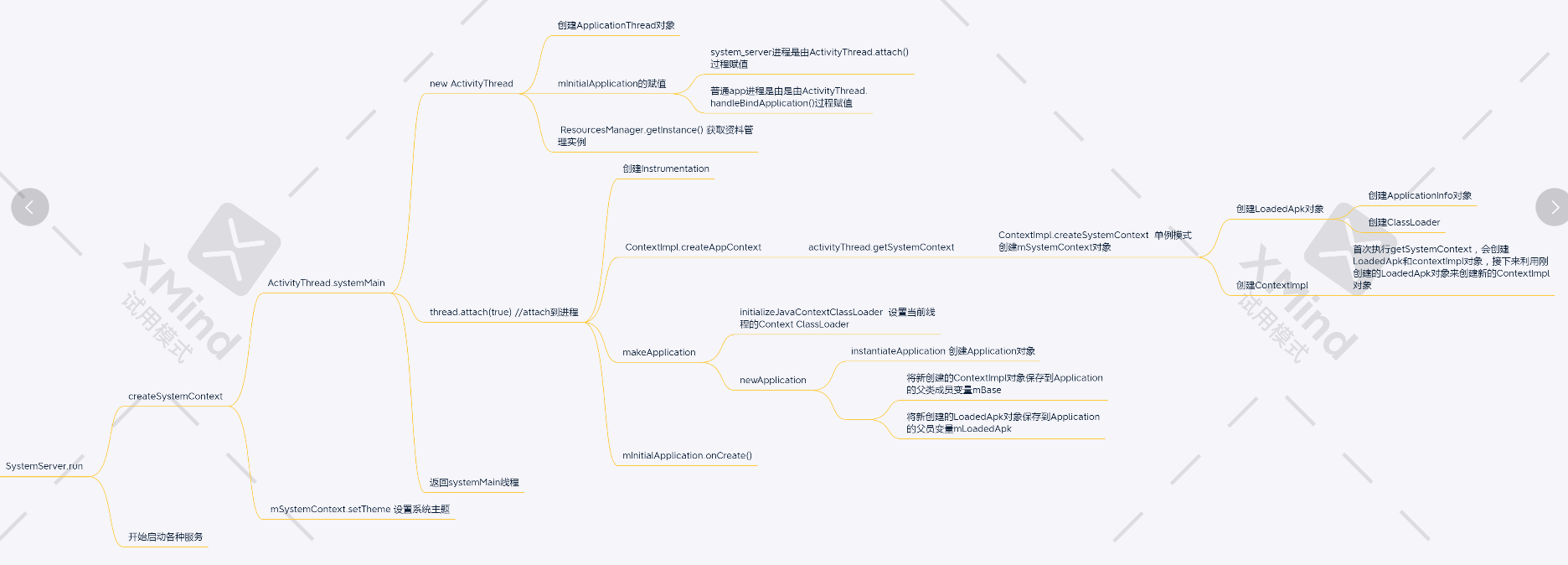 分析到这里。我们可以得出SystemServer进程创建Context的整个过程。我已经将整个流程整理成xmind文档了,如下图。App的启动流程大致与此相同,在细节上或有所差别。我们借助这个脉络分析App的启动流程。请接着往下看: