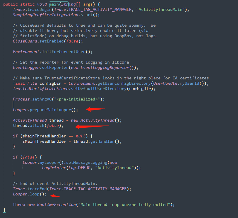 当Zygote收到请求:创建一个新的APP进程,之后,会调用ActivityThread的main()方法,代码如下: