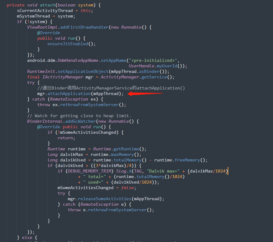 2>.创建ActivityThread对象,并调用attach(),这里与SystemServer进程不同的是APP的attch的参数是false SystemServer进程的是true. attrch为false时,代码如下: