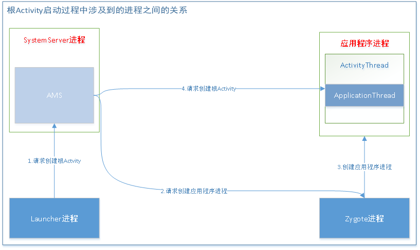 如下图所示,系统从Launcher出发,SystemServer进程在收到Launcher进程的启动一个APP的请求后。会先去请求Zygote进程创建一个新的应用进程,此时还是一个空进程。然后Zygote进程就会调用ActivityThread去初始化这个进程,包括Instrumentation,ApplicationThread,AppBindData等对象,创建完以后才会去真正创建APP的根Activity,并调用他的生命周期。