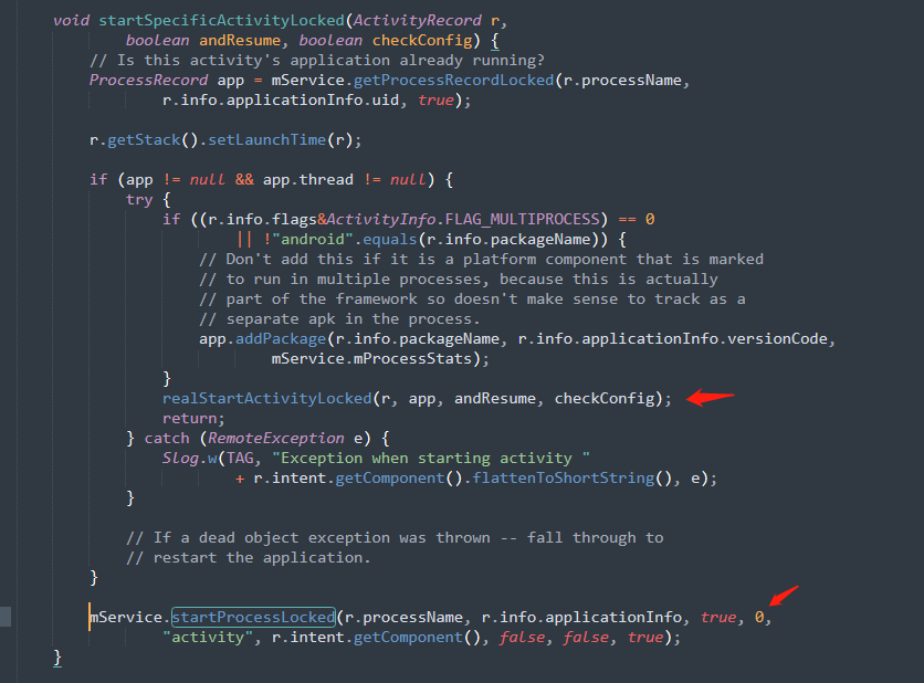 跟resumeFocusedStackTopActivityLocked()发现期调用了resumeTopActivityUncheckedLocked(),继续跟踪该方法。发现调用了resumeTopActivityInnerLocked(),还是跟。发现其调用了mStackSupervisor.startSpecificActivityLocked()。跟到这里。代码如下: