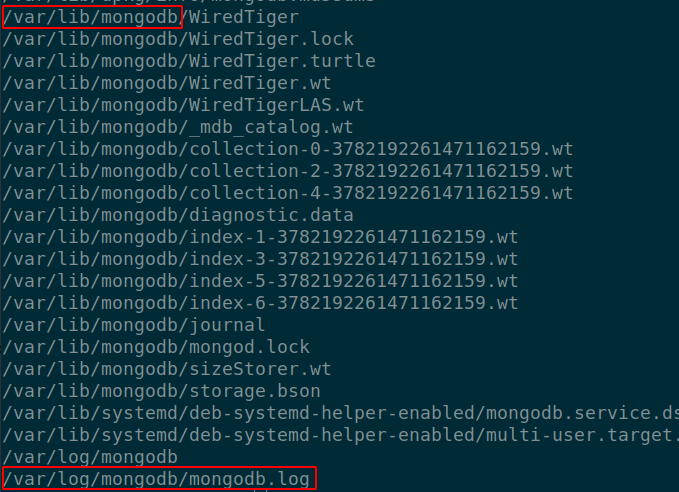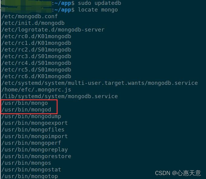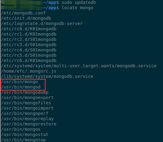 - 运行 “locate mongo” 命令查看系统默认把 mongo 装到了哪里,这里主要关注以下三点:
