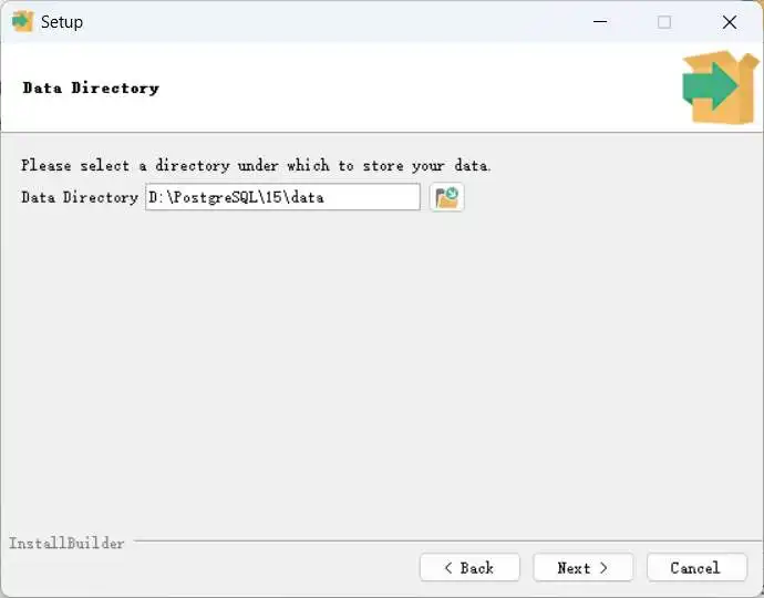 随后,需要配置一下PostgreSQL数据库的数据存放路径。这里建议就选择前述安装路径下的data文件夹即可,如下图所示。