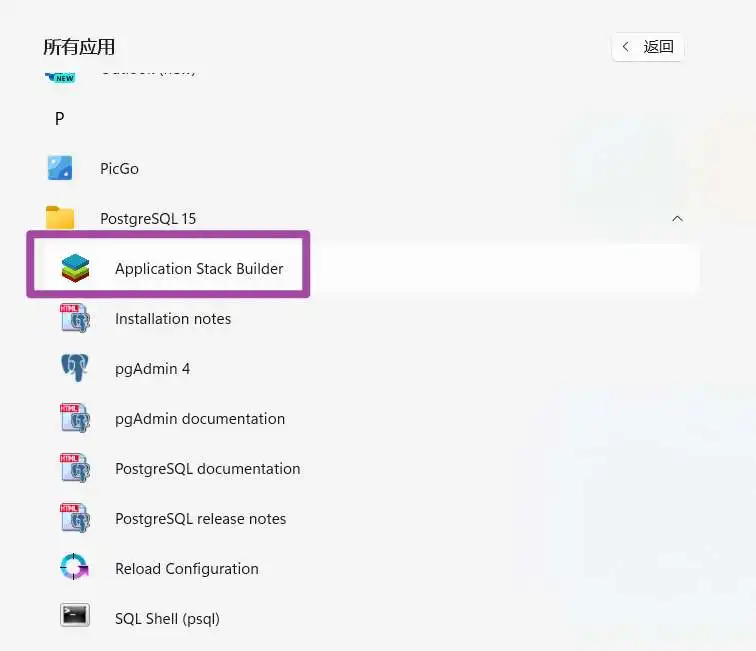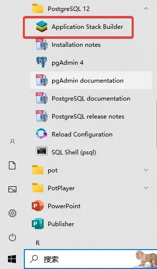 接下来,需要进行PostGIS的部署。如果前面大家没有打开Stack Builder,那么可以在开始菜单中找到其并打开,如下图所示。