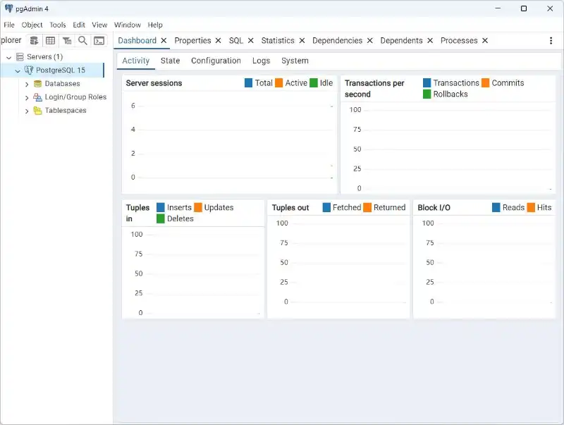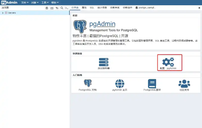 如果出现如下图所示的界面,表明我们本机的PostgreSQL已经下载、安装完毕,并且已经成功运行了PostgreSQL服务,且可以通过pgAdmin 4工具访问本地的PostgreSQL数据库了——在Windows下,PostgreSQL安装完毕后默认自动启动。