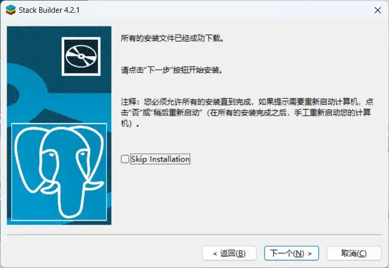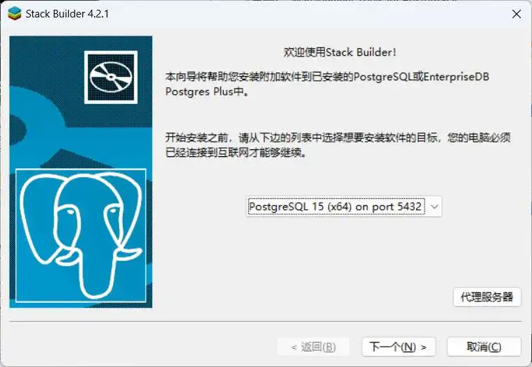 如果大家后面还需要安装PostGIS拓展,或者是其他PostgreSQL的拓展的话,建议就勾选上图中的勾选框。勾选之后,会在关闭PostgreSQL安装程序后,自动打开Stack Builder窗口,如下图所示;这个Stack Builder就是用来安装各类PostgreSQL的拓展的。打开这个Stack Builder界面之后,先不用管他,往下继续看本文即可。