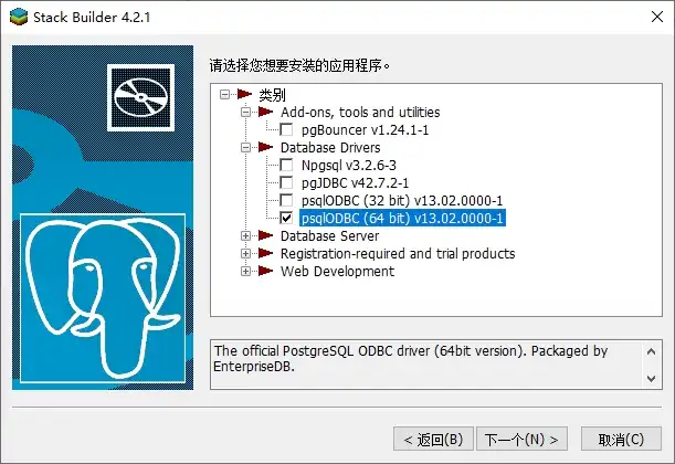 postgresql stack builder安装odbc驱动(网络很慢)/(可用我的离线包安装,安装在postgresql的目录,可手动创建一个文件夹),记得勾选enable all GDAL Drivers