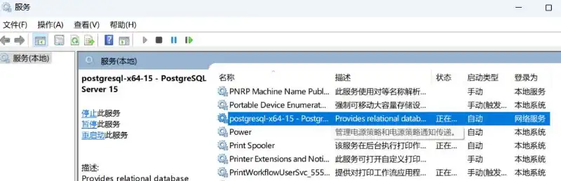 此外,如果电脑重启后,默认情况下PostgreSQL数据库服务应该也是默认自动启动的;如果没有启动,可以在服务列表中手动将postgresql-x开头的这个服务启动即可;如下图所示。