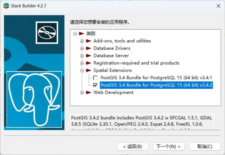 随后,在选择需要安装的应用程序时,在如下图所示的位置找到PostGIS,并安装新版本(版本号高的那个)即可。