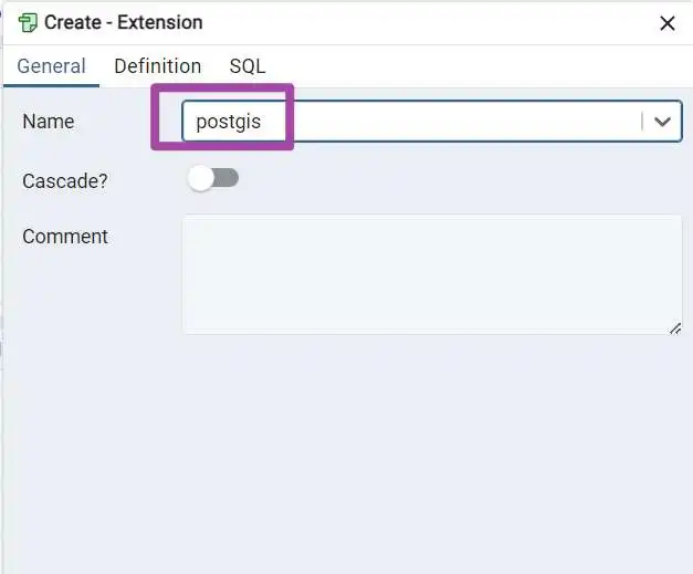 随后,在弹出的Extension选择窗口中,在Name后面的下拉框中找到postgis这个选项,如下图所示——这里也再一次验证了,其实PostGIS就仅仅是PostgreSQL的一个拓展(Extension)。