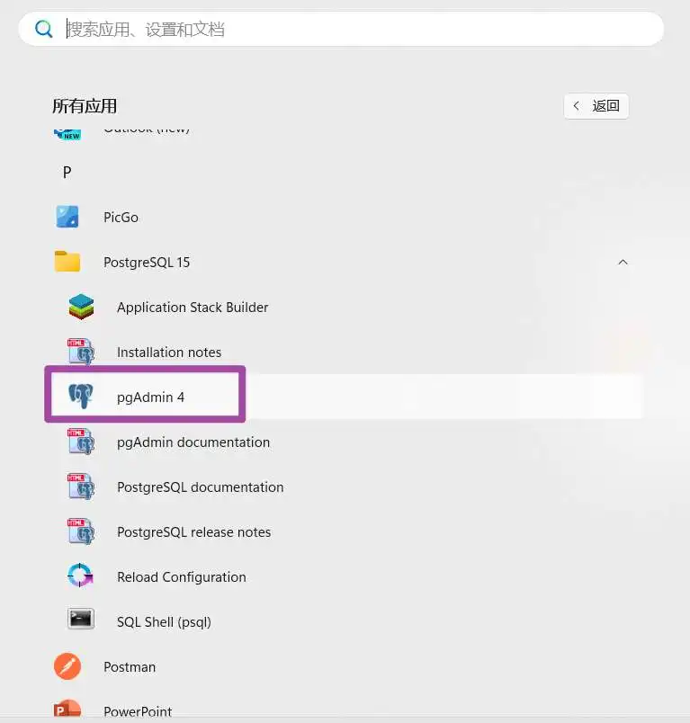 随后,在开始菜单中的应用列表中,在PostgreSQL XX文件夹中,找到并打开pgAdmin 4这个软件,如下图所示。