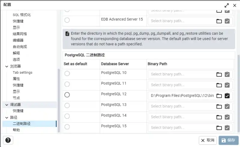 pgAdmin 配置 PostgreSQL 的命令行工具:设置二进制路径