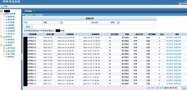 6:我的考试:考生可以查看到管理员指定给个人的所有考试,如果是正式考试,则要在指定时间才能参加考试,答题后提交或时间结束后自动提交,等评分后才能对答案看成绩。如果是练习测试,可以在任意时间参加,提交后就能查看答案,进行答题对比。