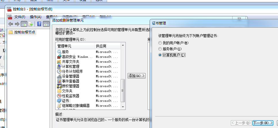 新建-->添加删除管理单元-->证书-->个人-->证书-->导入证书