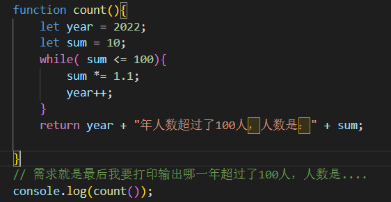 例3:今年是2022年,今天我们公司有10人,每年公司会以10%的比重招人(每年涨10%),问哪一年公司人数突破100人,人数是多少。
