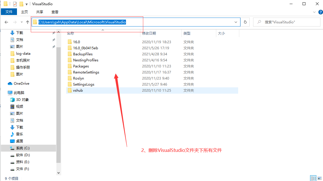 2、删除VisualStudio文件夹下面所有文件