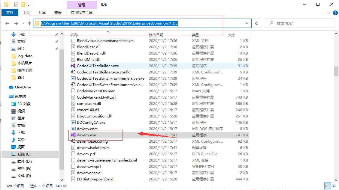 4、在Visual Studio IDE目录下执行devenv.exe文件。