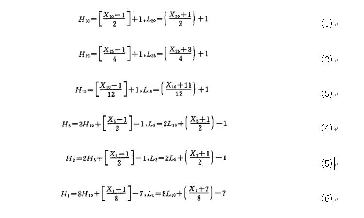 这里,式(1)~式(6)分别是1∶50万~1∶1万地形图的图号变换公式,H50,H25,H10,H5,H2和H1分别是1∶50万~1∶1万地形图的新图幅编号中的行代码,取三位,不足三位前面用“0”补足,L50,L25,L10,L5,L2和L1分别是1∶50万~1∶1万地形图的新图幅编号中的列代码,取三位,不足三位用“0”补足,X50,X25,X10,X5。X2和X1分别是1∶50万~1∶1万地形图旧图幅编号中相应比例尺地形图的图幅代码值,简称图幅代码值,如1∶50万地形图的图幅代码是A,B,C和D,则按字母排列顺序赋值分别为1,2,3,4,其他比例尺地形图的图幅代码也照此处理,[]表示小数取整,()表示小数取余。