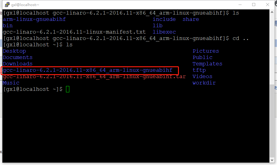 3、再次解压tar文件:tar -xvf gcc-linaro-6.2.1-2016.11-x86_64_arm-linux-gnueabihf.tar,至此,我们得到gcc-linaro-6.2.1-2016.11-x86_64_arm-linux-gnueabihf目录;