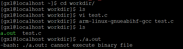 2、执行arm-linux-gnueabihf-gcc test.c,则可生成可执行文件a.out,此时执行./a.out,则打印-bash: ./a.out: cannot execute binary file,因为这是在imx6ull平台的可执行文件,后面我们可以在开发板上执行;