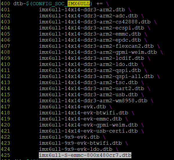 vi ./arch/arm/boot/dts/Makefile 找到dtb-$(CONFIG_SOC_IMX6ULL)在后面追加imx6ull-S-emmc-800x480cr7.dtb