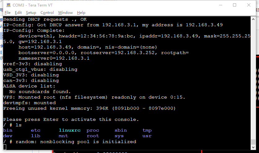 在uboot中配置好nfs启动(这里不详细介绍),将文件系统放于~/rootfs中(这里不详细介绍),给开发板上电,会看到加载zImage和dtb,并且也可以正常挂载nfs,即内核移植成功。