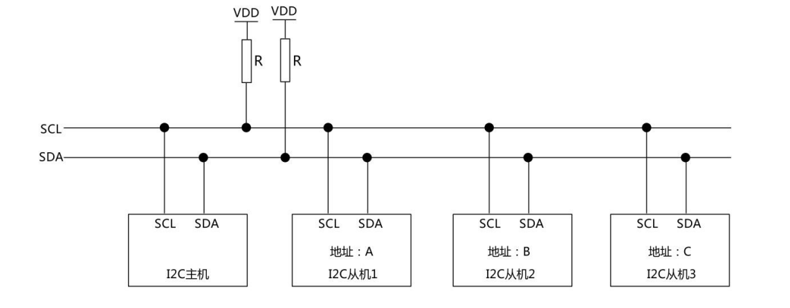 到同一总线的多个从机设备通讯,从设备都有唯一的地址,主设备通过从设备的地址和不同的从设备通讯