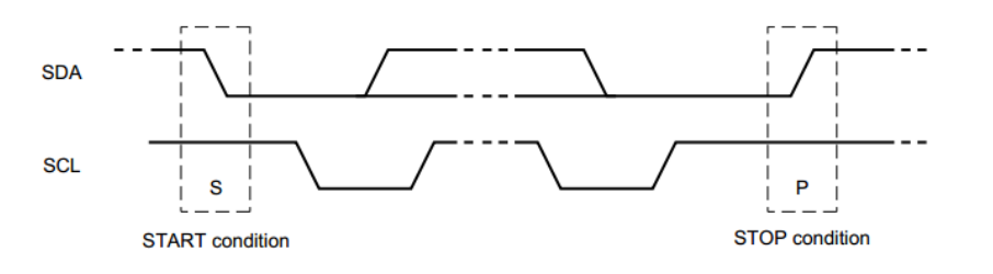起始信号和终止信号是由主机产生,当SCL为高电平,SDA从高电平转向低电平表示起始信号;