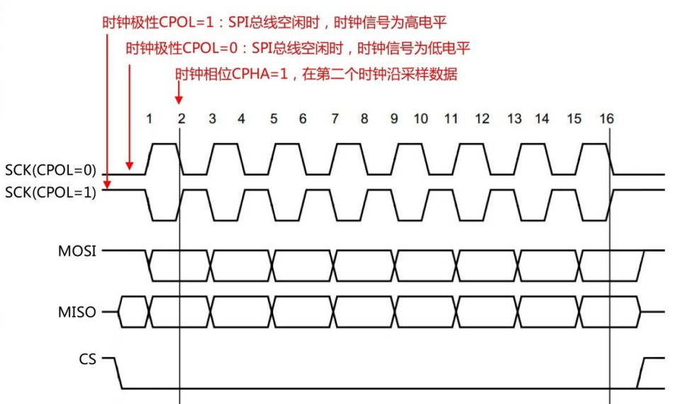 CPOL=1:SPI 总线空闲时,时钟信号为高电平。
