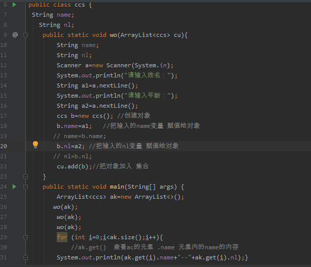 思路:1.创建Scanner 输入。2,创建对象,把输入内容赋值给对象。3创建ArrayList集合 。4把对象加入集合。5读取集合数据并打印。