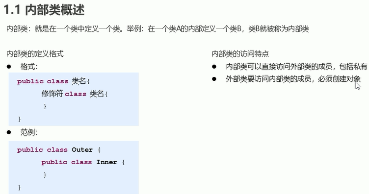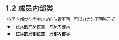 例:关键点 成员内部类在类中。 创建内部对象 主类名.内部类名 X=new 主类名().new 内部类名();