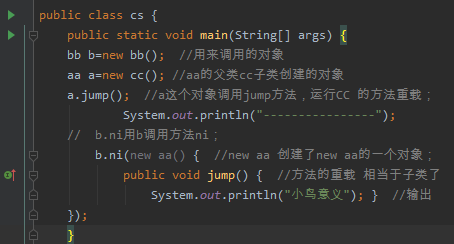 测试类 :总共3个对象,第1.个用于调方法。第2.个多态aa父cc子 ,调用jump方法重载。 第3.个new aa()多态,调用jump方法匿名类重载 。