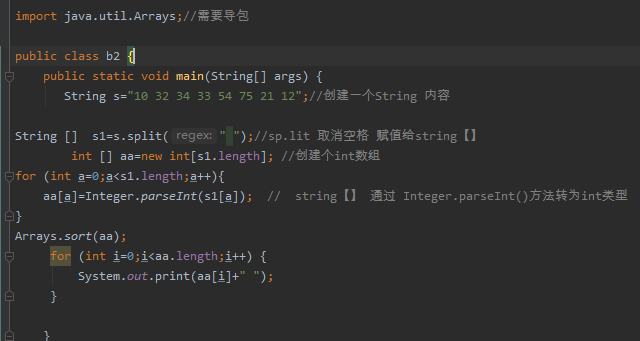 需求把:string类型的 数据 "10 32 34 33 54 75 21 12" 转为 int类型 数组 并由小到大排列