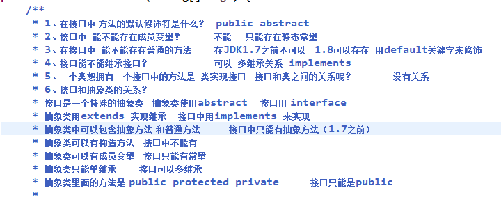 接口 用interface修饰的类 用implements来连接 可以多继承 不可以有构造方法 JDK1.7之前只能有抽象方法 只能有静态常量